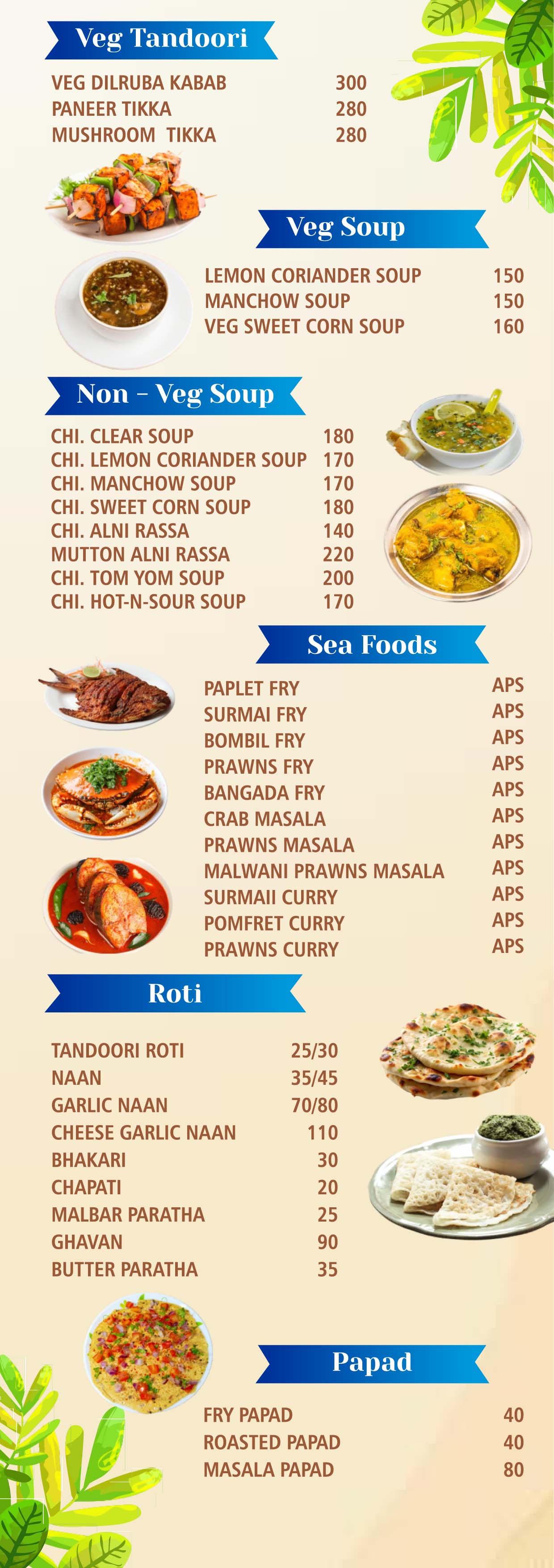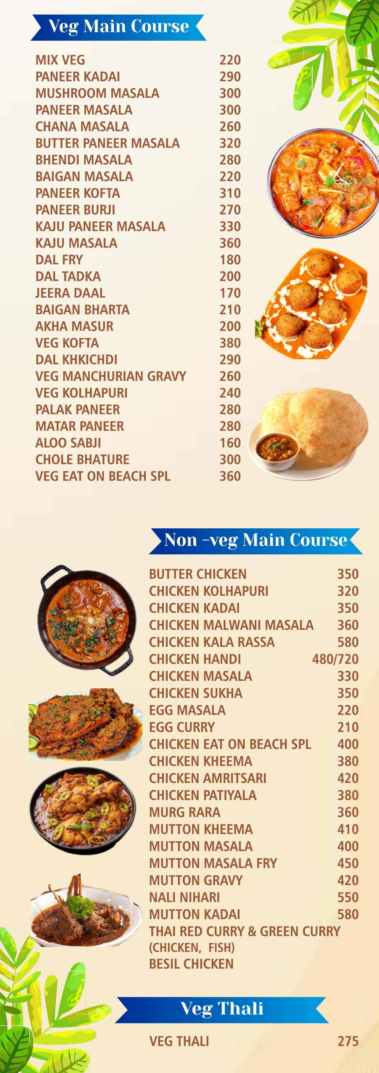 At Eat On Beach, every dish is crafted to bring you the authentic taste of Konkan along with your favorite Indian, Tandoor, Chinese, and Continental delights. From sizzling seafood and spicy curries to refreshing mocktails and desserts — our menu has something for everyone to enjoy by the sea.